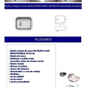 Bacha Simple Cocina 443e Acero Inox. Mi Pileta 44x34x20 Bril