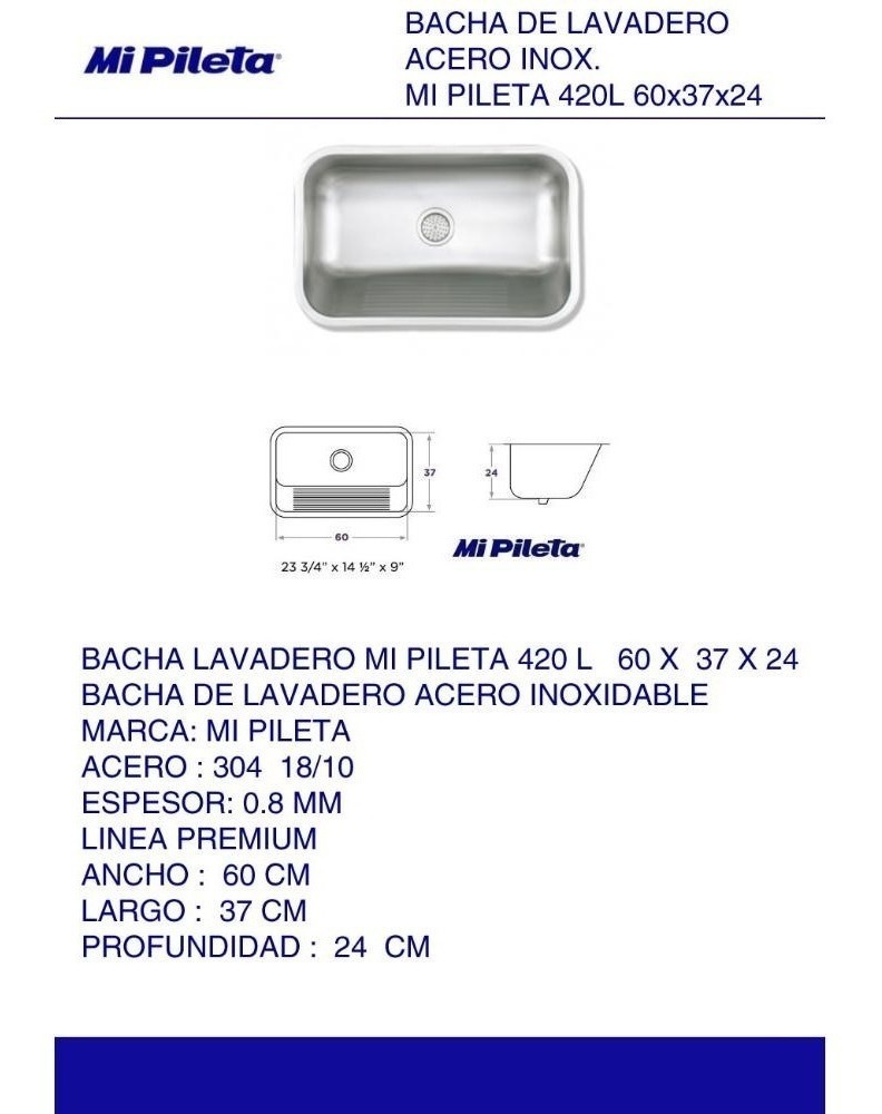 Bacha De Lavadero Acero Inox Mi Pileta 420l 60x37x24 Abajo