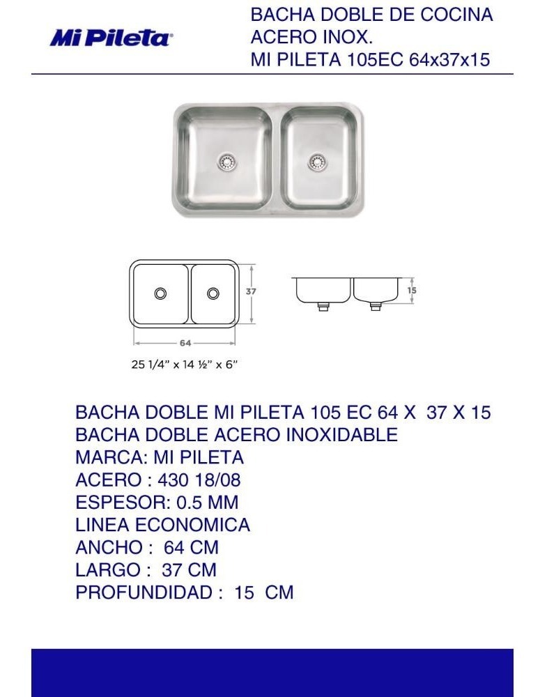 Bacha Doble Cocina 405e Acero Inox Mi Pileta 70x43x20