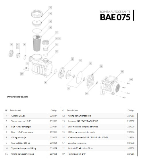 Para mayor comodidad, cuenta con una cesta de filtro integrada que atrapa las impurezas y evita que lleguen al motor, prolongando su vida útil y facilitando su mantenimiento. No esperes más y mejora la calidad del agua de tu pileta con la Bomba Vulcano BAE 075.